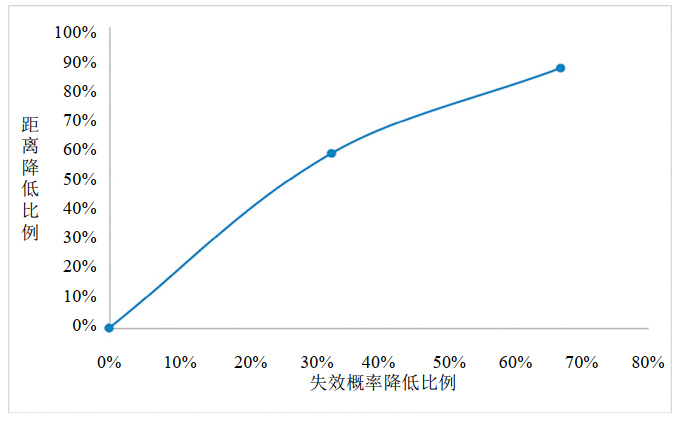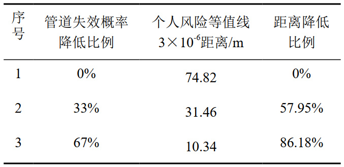由表 2中數據結果可以看出降低失效概率可以有效降低個(gè)人風(fēng)險和社會(huì )風(fēng)險,見(jiàn)表 1、圖 3。當失效概率減小為原來(lái)的67%時(shí),3×10-6個(gè)人風(fēng)險等值線(xiàn)距離管道的距離降低了57.95%;當失效概率減小為原來(lái)的33%時(shí),3×10-6個(gè)人風(fēng)險等值線(xiàn)距離管道的距離降低了86.18%。從圖4中可以看出失效概率與人風(fēng)險等值線(xiàn)距離管道的距離呈正相關(guān)性,個(gè)人風(fēng)險值與社會(huì )風(fēng)險結果對管道失效概率值的變化都較敏感。