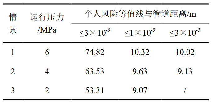 在假設其它條件不變的情況下,降低管道輸送壓力也會(huì )降低管道風(fēng)險。假設情景1為當前現狀,情景2為改變運行壓力為目前實(shí)際運行壓力的2/3,情景3為改變運行壓力為目前實(shí)際運行壓力的1/3。依次計算得到采取降壓措施導致個(gè)人風(fēng)險等值線(xiàn)與管道距離的關(guān)系,計算結果(表 3,圖 5)。