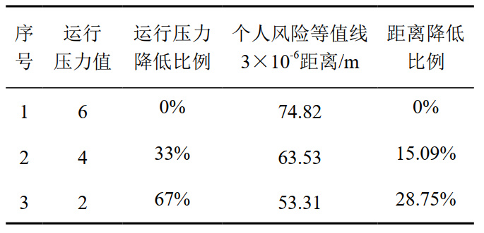 由表 4數據結果可以看出,運行壓力降低后個(gè)人風(fēng)險和社會(huì )風(fēng)險也隨之降低,見(jiàn)表 3、圖 5。當運行壓力降低為原來(lái)的67%后,3×10-6個(gè)人風(fēng)險等值線(xiàn)與管道的距離降低了15.09%。當運行壓力降低為原來(lái)的33%時(shí),3×10-6個(gè)人風(fēng)險等值線(xiàn)與管道的距離降低了28.75%。從圖 6中可以看出,運行壓力與個(gè)人風(fēng)險等值線(xiàn)距管道的距離呈正相關(guān)性。但個(gè)人風(fēng)險值和社會(huì )風(fēng)險值對管道運行壓力值的變化不敏感。