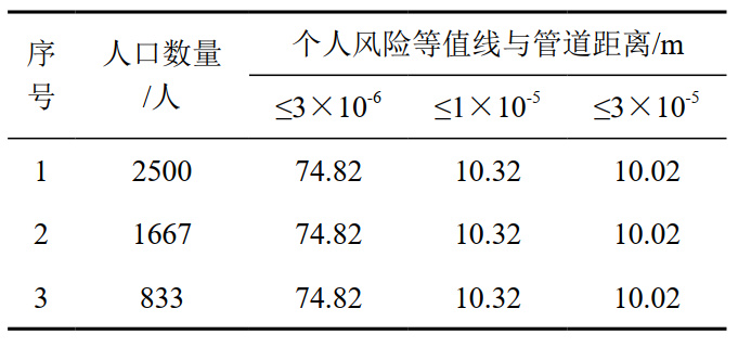 采取人口搬遷或管道改線(xiàn)措施,能使管道周?chē)丝跀盗拷档蛷亩_到降低管道風(fēng)險目的。情景1為現狀;情景2為假設其它條件不變,保持周邊人口區域位置不變,將周邊人口數量降為現有人口數量的2/3,一般采取改線(xiàn)或搬遷;情景3為假設其它條件不變,將周邊人口數量降為現有人口數量的1/3。依次計算得到采取措施后導致個(gè)人風(fēng)險等值線(xiàn)與管道距離的關(guān)系,計算結果(表 5)。