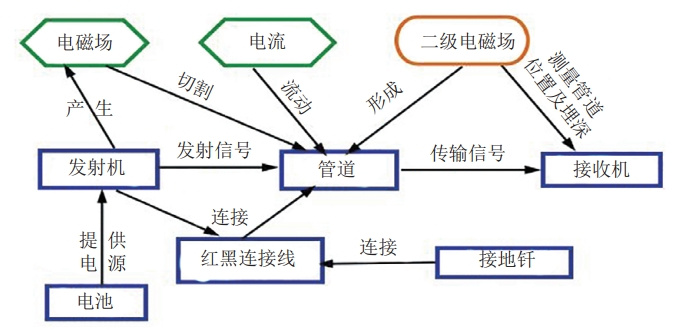 (2)現有技術(shù)系統的工作原理。該系統由發(fā)射機、接收機、紅黑直連線(xiàn)、接地棒、管道和大地組成。發(fā)射機的紅色線(xiàn)與管道線(xiàn)連接,黑色線(xiàn)與接地釬連接。電流從發(fā)射機通過(guò)管道到大地再到接地棒然后回到發(fā)射機形成一個(gè)回路。通過(guò)發(fā)射機對金屬管線(xiàn)施加信號,在金屬管線(xiàn)中產(chǎn)生電流并在管線(xiàn)周?chē)a(chǎn)生二級磁場(chǎng);通過(guò)接收機在地面上測定管線(xiàn)的二次磁場(chǎng),從而準確確定管線(xiàn)的位置和埋深。