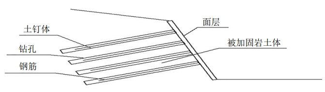 土釘墻的整體形式主要表現為在原狀土體中打孔,然后在預制孔中布置預先設定好的鋼筋后進(jìn)行混凝土注漿,并經(jīng)過(guò)養護使其形成一個(gè)完整且與周?chē)鷰r土體有很好粘結力的結構(圖 1)。同時(shí),在邊坡表面鋪設細小直徑的鋼筋網(wǎng)片,并噴射低強度混凝土來(lái)保護面層,既可以防止土體灑落,也具有一定美化效果。