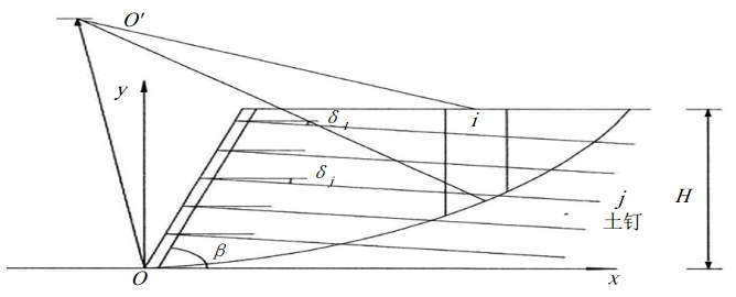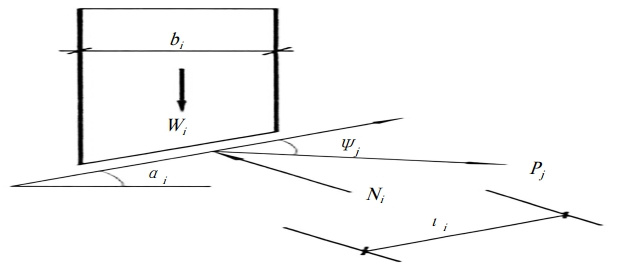 式中,FS為滑動(dòng)面的安全系數,n為土條數,Ci為第 i 條塊的粘聚力,ψi 為第 i 條塊的內摩擦角,bi為第 i 條塊底面水平方向上寬度,βi為第 i 條塊底面與水平面間的夾角,Wi為第 i 條塊重力,Li為條塊底面長(cháng),Sh為土釘的橫向間距,δj為第 j 排土釘與水平面間的夾角,Pj為第 j 排土釘提供的抗拔力,(j =1,2,...,n),Ψj 為第 j 排土釘與滑動(dòng)面切線(xiàn)間的傾角,Ψj  =ψi+δj 。