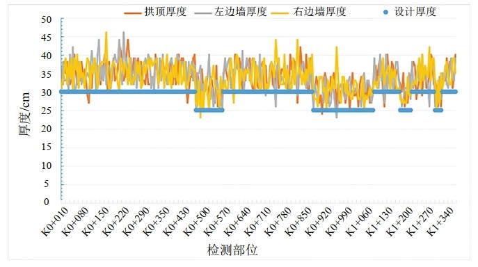 (1)襯砌厚度。沿檢測方向每間隔5 m測一組數據(拱頂,左、右邊墻),共測273組數據,測出有17處厚度不足,其中拱頂9處,左邊墻6處,右邊墻2處,欠厚最大處4 cm(圖 1)。
