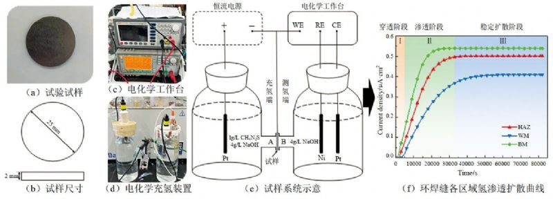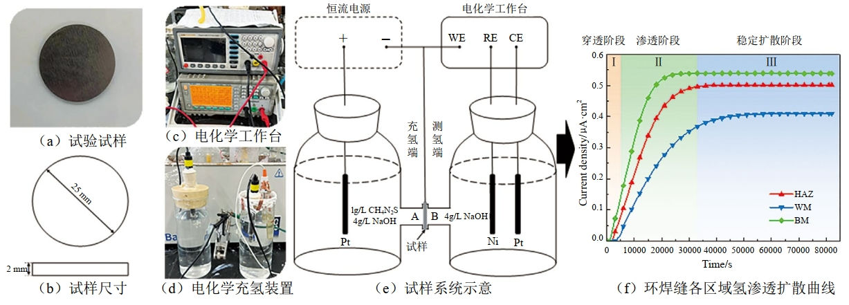 該試驗旨在深入分析管線(xiàn)鋼環(huán)焊縫區域的氫擴散特性,涉及母材、焊縫中心和熱影響區三個(gè)關(guān)鍵區域。在對各組織試樣進(jìn)行切割和研磨拋光后,通過(guò)氫滲透試驗研究環(huán)焊縫不同區域氫的擴散系數與表面吸附氫的濃度。在各區域沿管道壁厚方向制取直徑為25 mm,沿管道軸向厚度為2 mm的薄圓片試樣,用砂紙對圓片雙面進(jìn)行逐級打磨,直至2000#。為了防止試樣陽(yáng)極一側發(fā)生氧化反應產(chǎn)生非氫原子氧化產(chǎn)生的電流,將試樣的一側進(jìn)行鍍鎳處理。試驗結果表明,母材晶界的體積分數較大,可提供較寬的氫擴散通道,因此母材的有效擴散率最高;相比之下,熱影響區的氫擴散系數小于母材,表明在熱影響區存在較多氫陷阱,捕獲了部分氫原子,阻礙了氫的擴散;焊縫處的氫擴散系數最小,這是由于焊縫中的氫陷阱最多造成的(圖 1)。