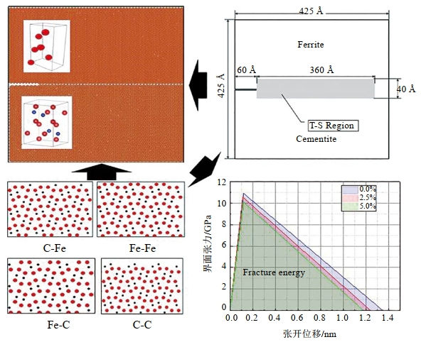 在微觀(guān)尺度下,主要通過(guò)分子動(dòng)力學(xué)模擬α-Fe由氫導致的韌性退化直至脆性斷裂的過(guò)程,分子動(dòng)力學(xué)模擬主要從原子層面研究材料在載荷作用下的力學(xué)行為,利用經(jīng)典運動(dòng)方程對一個(gè)系統中的N個(gè)原子或分子進(jìn)行逐步的數值求解。對于一個(gè)簡(jiǎn)單的原子系統,每個(gè)原子的動(dòng)力學(xué)過(guò)程由牛頓第二定律所控制。高鋼級管線(xiàn)鋼主要含鐵素體或由鐵素體與滲碳體組成的其他微觀(guān)組織。鐵素體具有體心立方點(diǎn)陣,而滲碳體具有正交晶格。鐵素體的強度和硬度相對較低,但其在塑性和韌性方面表現出色。在碳鋼和低合金鋼的熱軋(正火)和退火組織中,鐵素體占據主導地位。利用Atomsk建模軟件建立了尺寸為425 Å×425 Å×28.664 Å的鐵素體/滲碳體片層晶界結構,其中上層為鐵素體,下層為滲碳體(圖 2)。通過(guò)在模型中隨機摻入不同數量的氫原子模擬氫環(huán)境中晶界開(kāi)裂行為,此外還考慮了滲碳體四種不同終端(C-Fe、Fe-Fe、Fe-C、C-C)的影響。研究結果表明,隨著(zhù)氫原子濃度的增加,界面初始損傷對應的最大牽引力減小,臨界斷裂能也隨之降低,氫使得材料更易發(fā)生斷裂。