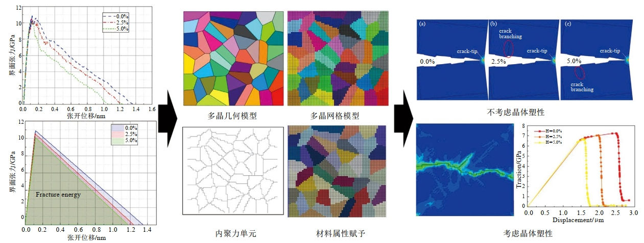 在細觀(guān)層次,泰森多邊形在建立多晶模型方面扮演了關(guān)鍵角色,每個(gè)泰森多邊形代表一個(gè)晶粒,其邊界相當于晶粒之間的界面。通過(guò)這種方式,利用泰森多邊形建?梢院(jiǎn)便地模擬和研究晶粒的大小、形狀和分布,這些都是影響材料性能的關(guān)鍵因素。例如,在金屬材料中,晶粒大小和分布直接影響材料的強度、塑性和疲勞壽命。除晶粒特征外,晶界同樣影響著(zhù)金屬材料的氫致開(kāi)裂行為。近幾年,由DUGDALE提出的內聚區模型被諸多學(xué)者用于模擬多晶模型的沿晶開(kāi)裂行為,晶界損傷參數可由微觀(guān)分子動(dòng)力學(xué)獲。▓D 3)。通過(guò)引入晶體塑性唯象本構用于表征多晶體在拉伸載荷作用下的塑性變形演化,使得結果更加真實(shí)可靠。模擬結果表明相同位移載荷下,氫使管材的啟裂時(shí)間提前,最終裂紋長(cháng)度增加。引入晶體塑性唯象本構后,模型應力呈不均勻分布,裂紋擴展路徑應力相對較大,且隨著(zhù)氫濃度的增加,材料由韌性斷裂轉變?yōu)榇嘈詳嗔选?o:p>
