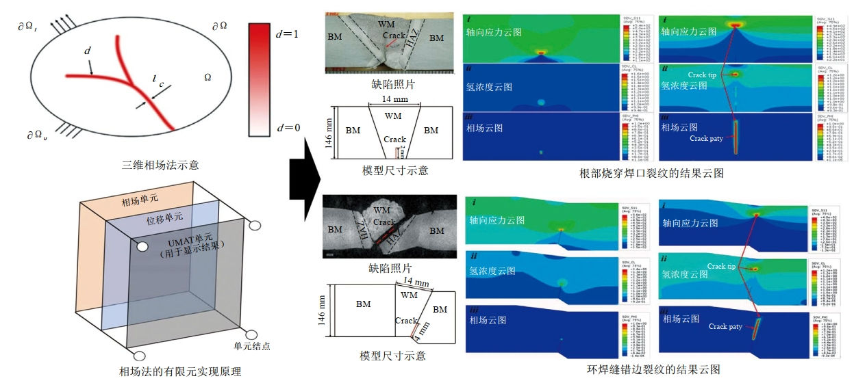 作為一種典型的彌散方法,相場(chǎng)法用一個(gè)標量場(chǎng),即相場(chǎng),描述尖銳裂紋拓撲。相較于XFEM、CZM,相場(chǎng)法避免了對不連續邊界的數值追蹤,并且不需要預估裂紋路徑。利用相場(chǎng)法建立焊縫根部燒穿缺陷與錯邊缺陷模型進(jìn)行模擬(圖 4),結果表明由于裂紋尖端處的靜水應力較高,隨著(zhù)裂紋的擴展,氫聚集于裂紋尖端處并且裂紋尖端的氫濃度出現了下降。此外,通過(guò)對比兩模型還可以發(fā)現,不同的缺陷類(lèi)型導致了裂紋擴展路徑的變化,模擬結果與實(shí)際相符。