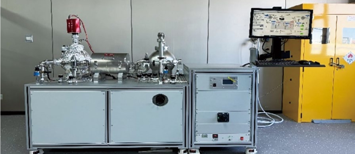 采用高溫高壓氣相氫滲透裝置進(jìn)行試驗(圖 2)。將試樣置于夾具內,并將夾具放入加熱爐內。充氫端為高壓氫氣,以模擬純氫管道真實(shí)環(huán)境;測氫端為四極桿質(zhì)譜儀,用于測定氫氣。將X52鋼切割成直徑20 mm、厚度2 mm的圓形薄片試樣,使用SiC砂紙打磨至2500#,進(jìn)行機械和電解拋光,去除表面殘余應力。處理完后,使用酒精沖洗3次,風(fēng)干后放入干燥箱備用。試驗前,將設備管路及腔體抽高真空,并使用氦氣檢漏。在充氫端使用氫氣吹掃,排除其他雜質(zhì)氣體成分對試驗結果的影響。通入試驗壓力的氫氣于預充罐,待預充罐內壓力傳感器示數穩定后,將氫氣通入充氫端腔體,達到試驗壓力后開(kāi)始試驗。采用四極質(zhì)譜儀檢測并記錄氫氣滲透速率Q(mol/s)數據隨時(shí)間變化。根據樣品有效滲透面積,計算樣品的氫滲透流流量J[mol/(m2·s)]。根據Sievert定律,氫滲透系數可表示為: