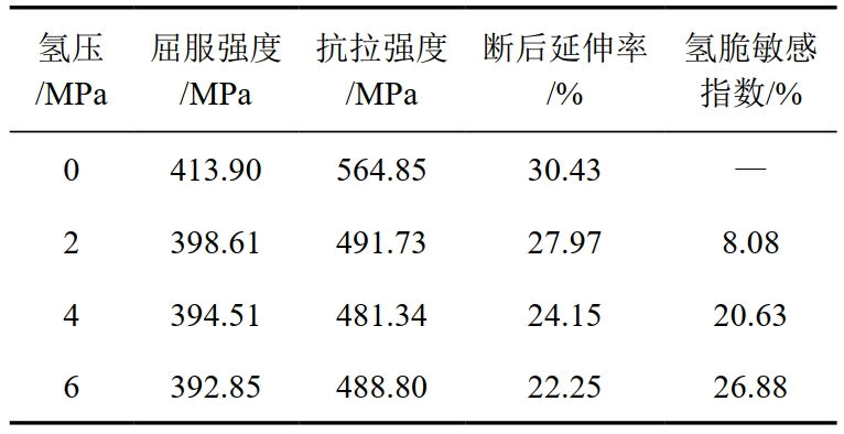 根據不同氫壓下X52管線(xiàn)鋼的應力—應變曲線(xiàn),對應不同氫壓下試樣的屈服強度、抗拉強度、斷后延伸率和氫脆敏感指數(圖 3、表 1)可以看出,隨著(zhù)氫壓不斷增大,試樣屈服強度略有降低、抗拉強度和斷后延伸率均減小,氫脆敏感性增大。當氫壓為6 MPa時(shí),X52鋼氫脆敏感指數為20.88%。