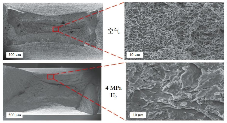 分析斷口微觀(guān)形貌(圖 4),X52鋼在空氣環(huán)境中進(jìn)行試驗后斷口呈典型韌性斷裂特征,斷口中心呈等軸韌窩,韌窩大小不一。但隨著(zhù)氫壓的上升,拉伸斷口由韌性斷裂向解理斷裂轉變,解理區域從外側向中心處延伸,出現解理臺階狀特征,與慢速率拉伸結果一致。