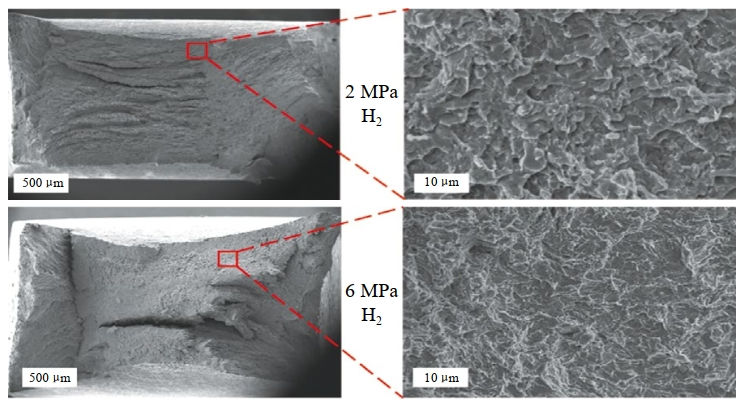 (2)X52鋼在空氣環(huán)境中進(jìn)行試驗后斷口呈典型韌性斷裂特征,斷口中心呈等軸韌窩,韌窩大小不一。但隨著(zhù)氫壓的上升,拉伸斷口由韌性斷裂向解理斷裂轉變,解理區域從外側向中心處延伸,出現解理臺階狀特征。
