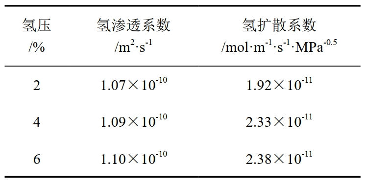 式中,Φ為氫滲透系數,mol·m-1·s-1·MPa-0.5;Jw 為穩態(tài)氫滲透流量,mol·m-2·s-1;ι為樣品厚度,mm;P為滲透時(shí)氫氣壓力,MPa。