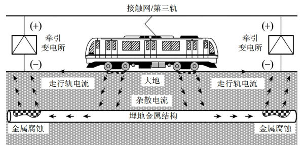 直流干擾源主要包括直流電氣化鐵路、城市軌道交通(地鐵)、直流輸電線(xiàn)路接地極、直流電網(wǎng)及其他構筑物陰極保護系統等。其中,地鐵干擾是最具代表性的動(dòng)態(tài)直流干擾類(lèi)型。地鐵供電系統主要由直流牽引變電站、饋電線(xiàn)、接觸網(wǎng)、列車(chē)、走行軌、回流線(xiàn)六部分組成。直流牽引變電站將外接交流電源降壓整流為直流電流,通過(guò)饋電線(xiàn)、接觸網(wǎng)給地鐵列車(chē)供電,并由走行軌和回流線(xiàn)牽引電流回流。其中,直流牽引系統回流電流的泄漏是對埋地油氣管道形成雜散電流干擾的主要原因;亓麟娏鲝淖咝熊壟c道床之間絕緣性能較差的部位泄漏進(jìn)入大地,流入大地的一部分電流會(huì )進(jìn)入附近防腐層較差的埋地管道,通過(guò)管道這一低電阻通道向遠處傳播,并在遠端防腐層破損部位流出管道,經(jīng)土壤回流至牽引變電站(圖 1)。雜散電流的流入點(diǎn)為陰極區,管地電位負向偏移,管道本體存在氫脆及防腐層剝離風(fēng)險;雜散電流流出點(diǎn)為陽(yáng)極區,管道本體存在加劇腐蝕風(fēng)險。