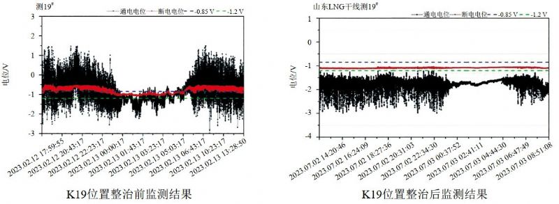 排流實(shí)施后,利用試片法對管道沿線(xiàn)進(jìn)行直流雜散電流復測,數據顯示管道電位波動(dòng)幅度明顯降低,其中K2處通電電位波動(dòng)由﹣4.364 V~4.06 V降低為﹣1.127 V~﹣3.318 V。管道斷電電位正于保護準則的比例均小于5%(圖 2),符合《AS 2832  Cathodic protection of metals Part1: pipes and cables》和GB 50991―2014要求,管道處于有效保護狀態(tài)。雜散電流整治效果評估完成后,在雜散電流整治區域安裝1處ER腐蝕速率探頭,利用腐蝕速率采集儀每年對ER腐蝕速率探頭的試片厚度進(jìn)行采集,根據壁厚減薄量持續監測管道的腐蝕速率,保證管道腐蝕情況安全受控。