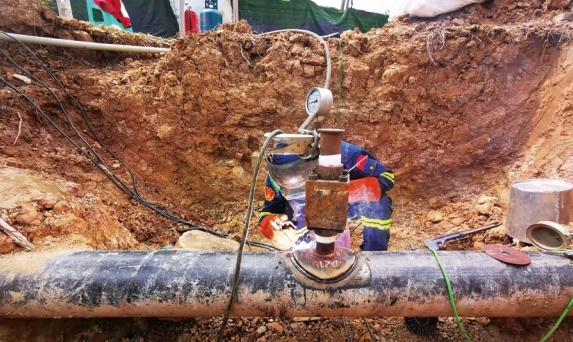 某機場(chǎng)在役Φ219 mm航空煤油管道設計壓力6.4 MPa,運行壓力3.5 MPa,全長(cháng)17.8 km、高程差240 m。某晚,管道在停輸回流狀態(tài)下出現壓力異常,3小時(shí)內管道靜壓下降了0.5 MPa,經(jīng)初步排查,排除溫差影響,認為管道壓降可能是因泄漏導致。為盡快排查壓降原因,管道管理單位聯(lián)合搶險單位利用補板式卡具排查輸油管道泄漏點(diǎn)工藝,進(jìn)行分段試壓,逐段縮小疑似泄漏點(diǎn)范圍,用時(shí)4天排查完全線(xiàn)管道,結合外防腐檢測、彈性波測漏技術(shù),成功找到了管道腐蝕泄漏點(diǎn),后采用帶壓焊接B型套筒方式完成管道修復。