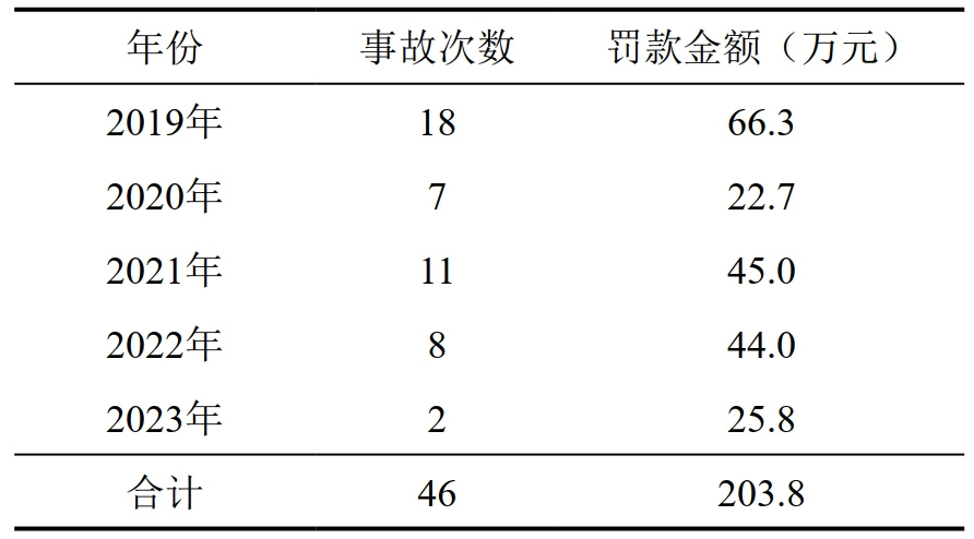 2019年以來(lái),武漢市第三方施工破壞燃氣管網(wǎng)事故數共計46起,對涉事第三方責任單位累計罰款金額203.8萬(wàn)元。其中2019年至2022年4年間事故數為44起,年均11起,累計罰款178萬(wàn)元,平均每起罰款4.05萬(wàn)元。2023年事故數僅2起,累計罰款金額25.8萬(wàn)元,平均每起罰款金額12.9萬(wàn)元(表 1)。