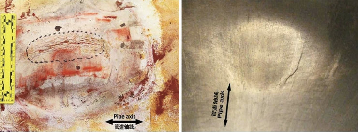 3 失效位置從管道內外觀(guān)察到的凹陷裂紋