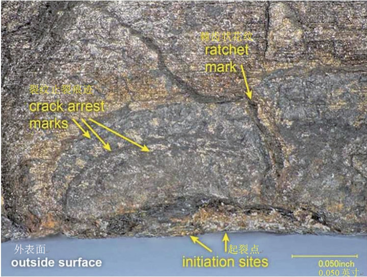 5 斷口顯示由腐蝕坑(圓圈)產(chǎn)生的直裂紋