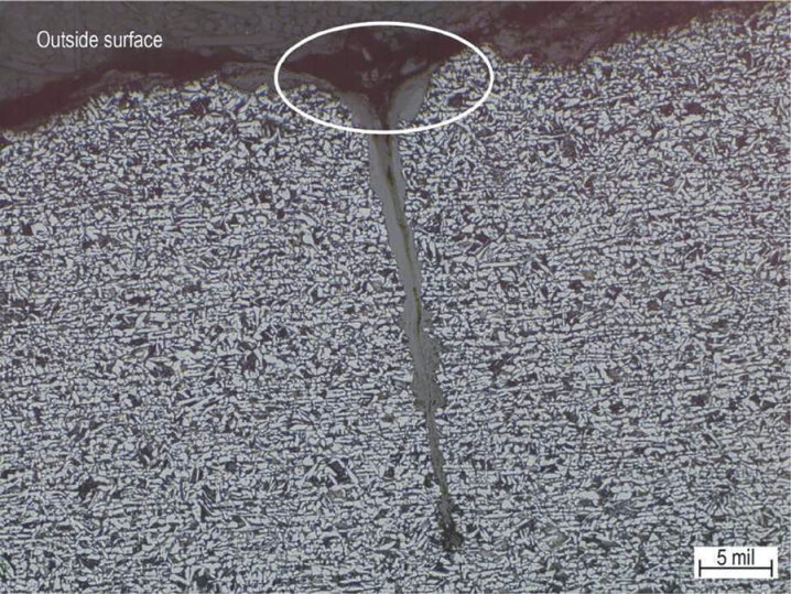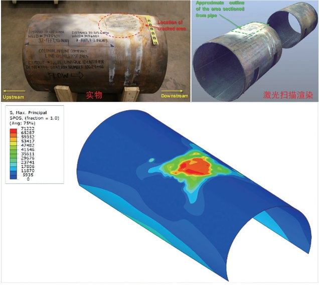 泄漏位置的凹陷很可能是由巖石撞擊管道底部形成,其深度約為管道外徑的1.6%(小于標準規定的6%的修復標準,管道公司未進(jìn)行響應)。通過(guò)激光掃描和有限元建模分析,凹陷形成后的峰值應力值超過(guò)了管道屈服強度,凹陷內的殘余拉伸應力較高。使得管道更容易受到應力腐蝕、腐蝕疲勞等外部引發(fā)的開(kāi)裂影響。此外,凹陷區域的幾何形狀變化產(chǎn)生的應力集中,足以在管道壓力波動(dòng)引起的循環(huán)加載條件下產(chǎn)生疲勞裂紋(圖 6)。