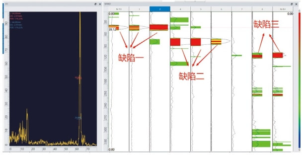 現場(chǎng)檢測圖譜中:缺陷一在圖譜中主要顯示通道為1和2通道,說(shuō)明該缺陷位于套筒側熔合區近表面,自身高度大于分區高度3 mm,缺陷長(cháng)度約15 mm;缺陷二在圖譜中主要顯示通道為4、5、6三個(gè)通道,說(shuō)明該缺陷位于套筒側熔合區中間部位,自身高度大于分區高度6 mm,缺陷長(cháng)度約15 mm;缺陷三在圖譜中主要顯示通道為8和根部槽通道,說(shuō)明該缺陷位于套筒側熔合區下表面,自身高度小于分區高度3 mm,缺陷長(cháng)度約15 mm。