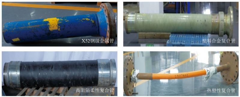 開(kāi)展適應性試驗的管材有X52鋼級金屬管、高阻隔柔性復合管、塑料合金復合管、熱塑性復合管等(圖 2)。