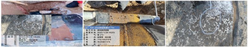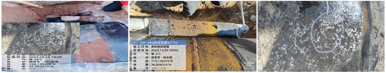 (4)環(huán)氧粉末(FBE)失效。2023年10月,甘陜分公司對西一線(xiàn)干線(xiàn)某處防腐層缺陷點(diǎn)進(jìn)行開(kāi)挖修復,發(fā)現該點(diǎn)位于管道彎頭處,防腐層外觀(guān)顏色深淺不一并伴有鼓包和破損,環(huán)氧粉末層(FBE)不光滑、不均勻并出現大面積脫落。本處開(kāi)挖直接檢測到防腐層有多處破損,有機械損傷所致,也有防腐材料脫落所致,F場(chǎng)提取腐蝕產(chǎn)物呈現黃色,土壤呈堿性。