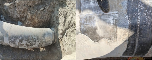 通過(guò)對該處防腐層異常破損情況進(jìn)行分析,環(huán)氧粉末(FBE)大面積失效的主要原因是材料質(zhì)量和施工工藝問(wèn)題。一是熱煨彎頭在工廠(chǎng)進(jìn)行環(huán)氧粉末噴涂工藝過(guò)程中,會(huì )導致大量粉末沒(méi)有附著(zhù)在管道上而是沉降在底部。這些已經(jīng)接觸過(guò)高溫的粉末按要求不允許使用,但是廠(chǎng)家基于成本考慮有時(shí)會(huì )摻雜在新粉末里使用,這就導致環(huán)氧粉末的材料極有可能本身不達標。二是環(huán)氧粉末加熱的溫度或時(shí)間控制不好,有些過(guò)高溫烤焦碳化,有些溫度不夠導致粘結力不足。管道剛敷設后環(huán)氧粉末涂層并未出現明顯異常,但是管道運行數年后環(huán)氧粉末質(zhì)量問(wèn)題會(huì )逐步暴露。環(huán)氧粉末(FBE)失效如圖 8所示。