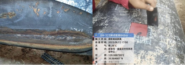 (2)如何看待防腐層缺陷開(kāi)挖驗證數據與外檢測報告相關(guān)性的問(wèn)題。首先,管道防腐層外檢測一般采用PCM+DCVG+ACVG+CIPS等方法開(kāi)展,通過(guò)漏點(diǎn)信號強度dB值、土壤腐蝕性、腐蝕活性、陰保狀態(tài)等多個(gè)指標對防腐層破損點(diǎn)的嚴重程度進(jìn)行劃分,一般分為嚴重、中度、輕度等3個(gè)等級,從而指導管道企業(yè)采取立即維修、計劃維修、監控運行等治理措施。其次,通過(guò)對西一線(xiàn)干線(xiàn)100處防腐層缺陷點(diǎn)開(kāi)挖驗證發(fā)現,防腐層缺陷點(diǎn)的實(shí)際嚴重程度往往與外檢測報告給出的嚴重程度并未呈現正相關(guān)。29處嚴重等級的缺陷點(diǎn)經(jīng)開(kāi)挖驗證后相當一部分破損情況并不嚴重,69處腐蝕活性為陰極的缺陷點(diǎn)實(shí)際腐蝕情況卻并不樂(lè )觀(guān),反映出影響管道缺陷點(diǎn)特征的因素和成因較為復雜。如圖 9所示,左圖外檢測結果為中度等級實(shí)際上卻比較嚴重,右圖外檢測結果為嚴重等級實(shí)際上并不嚴重。