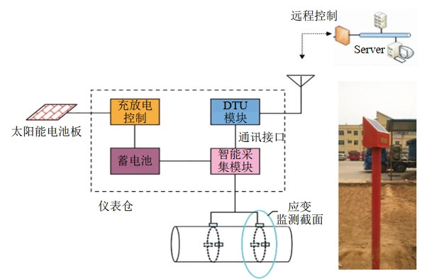 (1)監測裝置。野外監測裝置由太陽(yáng)能供電系統、智能采集模塊、DTU模塊、監測樁體四大部分組成(圖 1)。數據采集儀與振弦式應變計之間通過(guò)雙絞線(xiàn)實(shí)施通訊連接,振弦式應變計監測的振頻模數經(jīng)采集儀壓縮、存儲后,由數據采集儀通過(guò)DTU模塊連接到互聯(lián)網(wǎng),并通過(guò)網(wǎng)絡(luò )服務(wù)器與監控中心服務(wù)器連接,實(shí)現數據的采集或對現場(chǎng)數據采集儀發(fā)送相關(guān)測控指令。