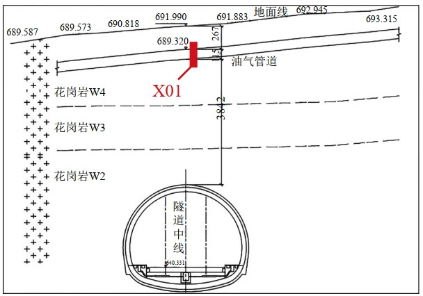 在建龍龍鐵路龍武段雙髻山隧道(以下簡(jiǎn)稱(chēng)雙髻山隧道)位于福建省龍巖市上杭縣蛟洋鎮,在隧道DK 13+450 m處下穿在役西氣東輸三線(xiàn)管道(IB 017+700 m),管徑1219 mm,壁厚18.4 mm,材質(zhì)L555鋼,設計壓力10 MPa,隧道拱頂距離管道最近處約36.7 m,兩者交叉角度為79°。