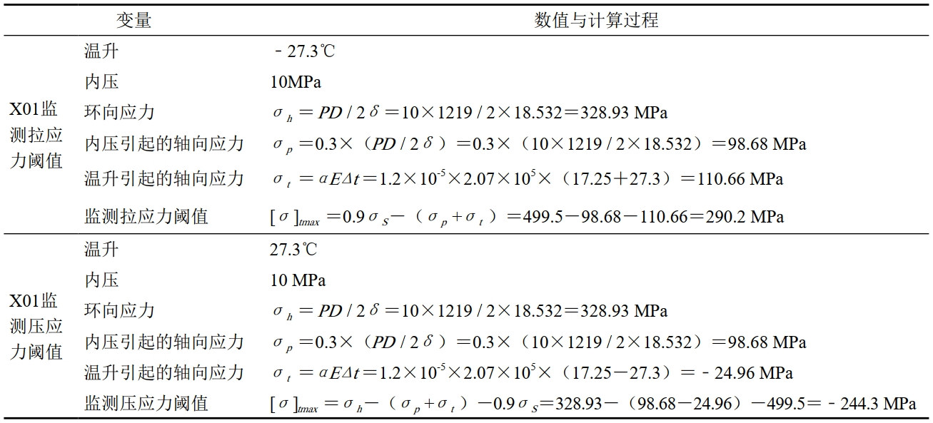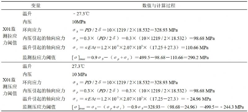 (1)管道監測應力閾值計算。依據GB 50251―2015《輸氣管道工程設計規范》,管道軸向應力按式(1)計算: