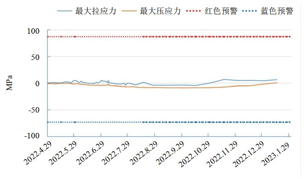 根據公式計算各監測截面監測拉、壓應力閾值如表 1所示,采用安裝時(shí)溫度17.25℃,正負溫差變化為±27.3℃:計算出監測拉應力閾值和壓應力閾值分別為290.2 MPa、﹣244.3 MPa。