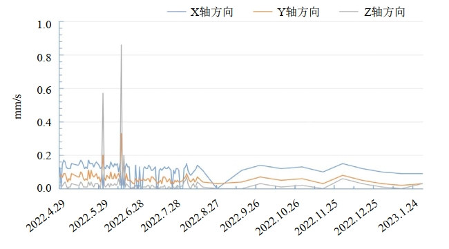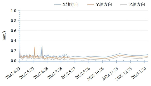 (4) 管道應力監測數據分析。施工后對管道應力應變、位移(沉降)、振動(dòng)實(shí)施9個(gè)月的現場(chǎng)監測。應力監測時(shí)程曲線(xiàn)如圖 3,在整個(gè)監測周期內,監測截面管道附加應力均處于較小值,最大拉應力6.93 MPa,最大壓應力﹣8.95 MPa,遠未達到藍色預警值。累積沉降位移變化曲線(xiàn)如圖 4,當前測點(diǎn)累積沉降位移值偏小,僅為﹣0.793 mm ,遠小于安全閾值10 mm。2個(gè)監測截面振動(dòng)速度隨時(shí)間變化曲線(xiàn)如圖 5、圖 6,各測點(diǎn)振動(dòng)速度值較小,均遠小于安全閾值。其中,Z01測點(diǎn)沿Z軸方向振動(dòng)速度最大值為0.86 mm/s,Z02測點(diǎn)沿X軸方向振動(dòng)速度最大值為0.31 mm/s,均小于管道安全速度1.7 cm/s。