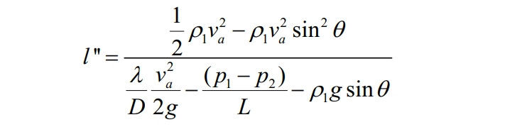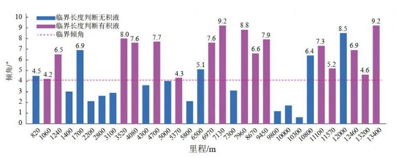 (1)評價(jià)方法優(yōu)化。本方法在NACE標準基礎上,針對臨界傾角法未考慮管道傾角處上坡段長(cháng)度以及在地形平坦地區應用效果較差的問(wèn)題,提出利用傾角處管道長(cháng)度進(jìn)一步判別該處是否可能積液。判別臨界長(cháng)度之前的步驟與NACE標準步驟相同,在間接評價(jià)得到臨界傾角后,對每個(gè)大于臨界傾角的位置進(jìn)行二次計算;贜ACE標準中臨界傾角的計算公式,經(jīng)過(guò)改進(jìn)后得到了本方法中臨界長(cháng)度ι''的表達式: