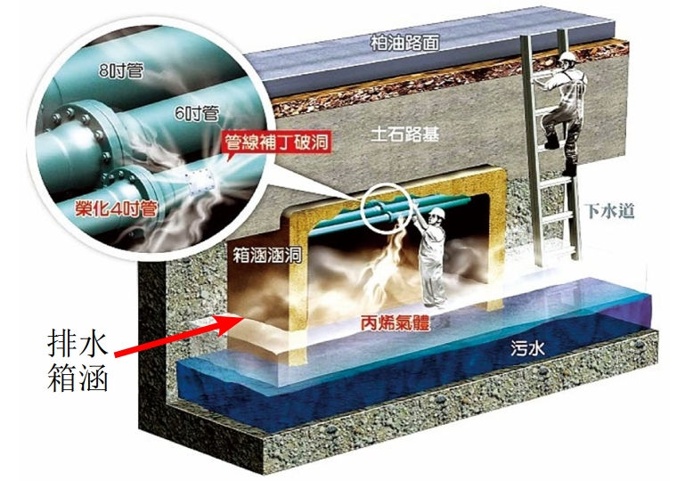1 丙烯管線(xiàn)直接貫穿排水箱涵