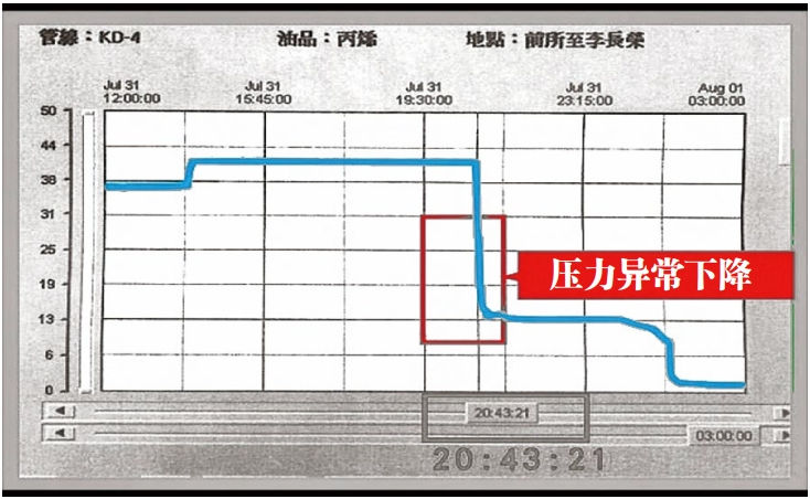 1974年至1979年間,臺灣有關(guān)部門(mén)為了改善基礎設施及實(shí)現產(chǎn)業(yè)升級,進(jìn)行了十大基礎設施建設,高雄區成為發(fā)展石化等重工業(yè)的重鎮。市區道路下方埋設了復雜的石化管線(xiàn),與市政建設的水電設施交錯在一起,就此埋下了隱患。此次氣爆的范圍擴及2~3公里范圍內的多個(gè)街道,這是因為當丙烯發(fā)生泄漏時(shí),第一時(shí)間到場(chǎng)的消防隊、石化企業(yè)及市政建設主管部門(mén)都無(wú)法精確掌握管線(xiàn)設施的基本情況,泄漏的丙烯氣體隨著(zhù)地下排水箱涵流竄至多個(gè)街道,隨后陸續觸及火花而接連引爆。災后調查發(fā)現,泄漏發(fā)生時(shí),使用該管線(xiàn)輸送丙烯的供應及接收企業(yè)已察覺(jué)到輸送過(guò)程有不正常的壓力下降(圖 3),但卻不明究理而持續輸送,更加劇了爆炸的規模,不僅炸翻多條路面,甚至將路邊停放的汽車(chē)炸飛至三樓頂,直接財產(chǎn)損失數十億臺幣以上。后續衍生的問(wèn)題還包括:民眾對地下石化管線(xiàn)莫名的恐懼與抗爭,石化產(chǎn)業(yè)發(fā)展停滯且面臨存廢的挑戰,以及地方政府與上級石化監管權責的爭議不休。