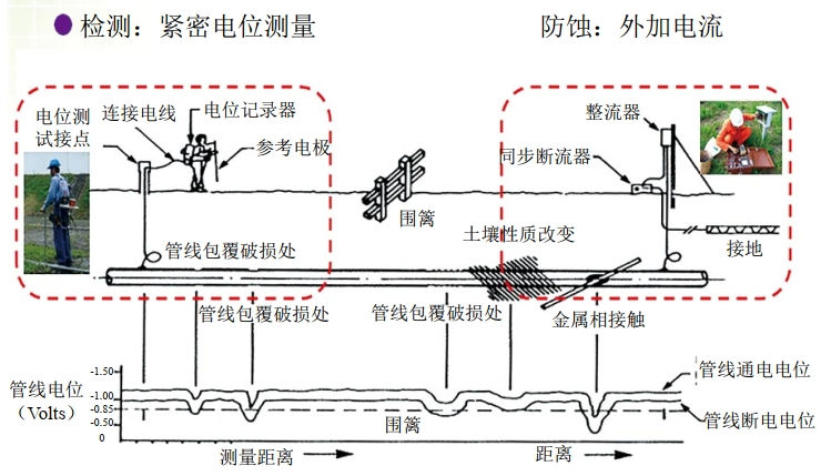 ①管線(xiàn)埋設時(shí),在外層先包覆絕緣層。一般采用塑料材質(zhì),如聚乙烯(polyethylene)做批覆,減少金屬管直接與氧氣接觸,作為第一道防腐保護。②第二層保護是采用電化學(xué)效應的“陰極防腐法”。通電將管材(如鐵管)當陰極,另置鋁或鎂作犧牲陽(yáng)極,使腐蝕集中于陽(yáng)極,相對避免管材腐蝕。③定期、定點(diǎn)檢查管線(xiàn)的陽(yáng)極電位是否足夠,提供適當防腐保護。并據此決定是否有防腐效用,并找出異常區段予以修復或替換。