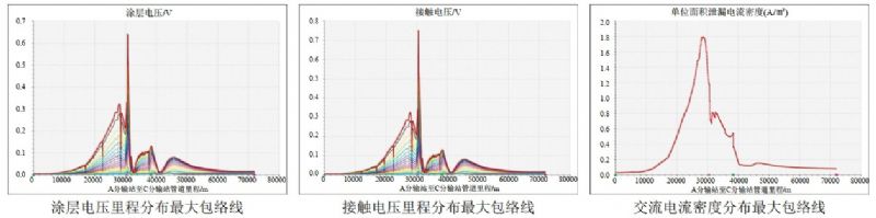 軌道交通下行方向單線(xiàn)單車(chē)行駛。管道沿線(xiàn)最大交流干擾電壓為0.510 V,管道沿線(xiàn)最大涂層電壓為0.631 V,地面可接觸物體(如測試樁、閥室等)的最大接觸電壓為0.74 V,均未超過(guò)安全限值。流過(guò)1 cm²缺陷孔的最大泄漏電流密度為1.805 A/m²,低于30 A/m²,交流腐蝕風(fēng)險為低。