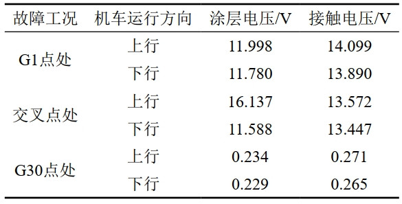 軌道交通上、下行方向,接觸線(xiàn)與鐵軌短路故障在三種不同點(diǎn)位時(shí),計算出埋地管道沿線(xiàn)最大涂層電壓及地面可接觸物體(如測試樁、閥室等)的最大接觸電壓(表 1)。三種故障工況下,埋地管道沿線(xiàn)最大涂層電壓均遠小于安全限值5 kV標準,地面可接觸物體(如測試樁、閥室等)的最大接觸電壓也均未超過(guò)安全限值584.47 V。