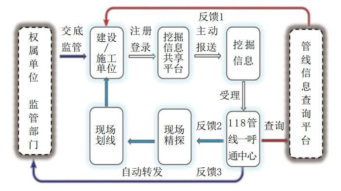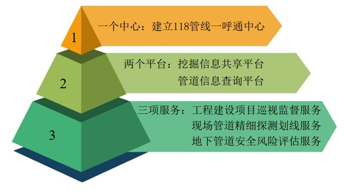 (1)搭建一呼通平臺。平臺總體業(yè)務(wù)架構為一個(gè)中心、兩個(gè)平臺、三項服務(wù)的“1+2+3”模式(圖 1)。一個(gè)中心即118一呼通中心,負責建立政府部門(mén)、建設單位、施工單位、權屬單位的工作聯(lián)系溝通平臺。兩個(gè)平臺即建立挖掘信息共享平臺、管道信息查詢(xún)平臺,共享平臺實(shí)現上報工程信息及共享、溝通、監督執行過(guò)程、形成處理結果,查詢(xún)平臺實(shí)現全域管道數據查詢(xún)和數據共享。三項服務(wù)即針對政府監管部門(mén)提供平臺報備、管道資料、現場(chǎng)交底、防護措施等服務(wù),針對建設單位、施工單位、權屬單位,提供現場(chǎng)挖掘、施工詳查、開(kāi)挖劃線(xiàn)、保險理賠等服務(wù),針對其他相關(guān)單位,提供隱患排查、定期巡查、安全評估、防護咨詢(xún)等服務(wù)。