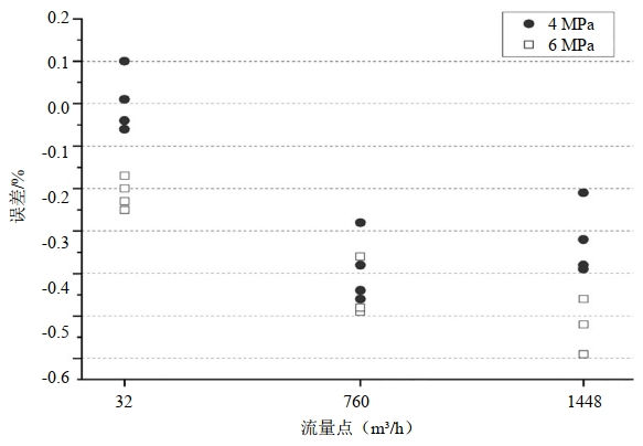 穩定性實(shí)驗。選取DN80和DN250的渦輪流量計,選用音速?lài)娮旆怏w流量標準裝置進(jìn)行測試。分別在4 MPa、6 MPa情況下對32 m³/h、760 m³/h、1448 m³/h進(jìn)行實(shí)驗,結果表明裝置的穩定性均≤0.22%(圖 1)。