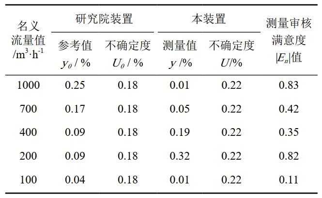 測量審核結果。為了驗證裝置的校準能力,選用一臺Elster型號為SM-RI-X G650的DN150渦輪流量計作為傳遞標準,在本音速?lài)娮煅b置及中國計量科學(xué)研究院的環(huán)道式氣體流量標準裝置上進(jìn)行測量審核,滿(mǎn)意度按式(1)計算: