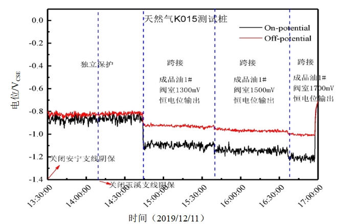 (4)天然氣干線(xiàn)和成品油干線(xiàn)沿線(xiàn)無(wú)絕緣接頭,管道沿線(xiàn)存在多套干線(xiàn)陰極保護系統,并且新建管線(xiàn)防腐層質(zhì)量較好,上下游的陰極保護系統可以保護的距離足夠覆蓋測試管段,跨接前后測試樁通斷電電位無(wú)明顯變化,不建議在干線(xiàn)進(jìn)行多處跨接來(lái)緩解目前可接受的干擾問(wèn)題。