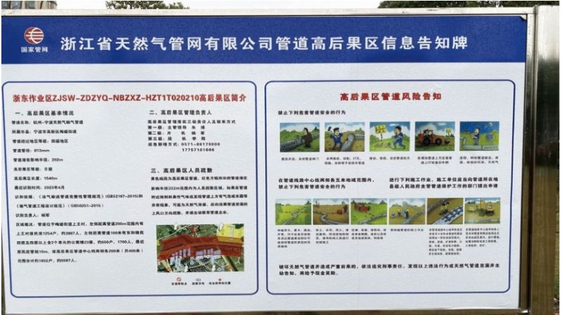 (2)開(kāi)展精準宣傳。專(zhuān)職區長(cháng)與巡線(xiàn)人員按規定對高后果區開(kāi)展精準宣傳工作,發(fā)放管道保護宣傳品,提高高后果區周邊人員管道保護及應急逃生意識。每處高后果區均設置有高后果區告知牌和安全提示牌(圖 1),明確管道周邊、核心保護區內危害管道的各類(lèi)行為和特定施工作業(yè)需辦理的許可手續等。