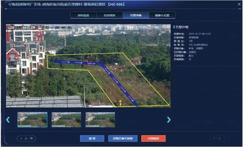 (5)實(shí)施智能監控。每處高后果區均設置有智能攝像頭對管道周邊情況進(jìn)行實(shí)時(shí)監控,Ⅲ級高后果區另外設置鐵塔視頻監控,運維單元設有實(shí)時(shí)管理平臺,監控系統按照管道保護范圍設置10 m寬度的電子圍欄(圖 3),對進(jìn)入電子圍欄范圍內的機械作業(yè)即刻推送報警信息至該專(zhuān)職巡線(xiàn)人員的手機App上。高后果區內第三方施工頻繁區域還安裝有斷線(xiàn)報警器等技防設備。