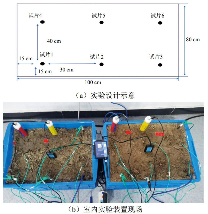 實(shí)驗設計土壤箱尺寸為1 m×0.8 m(圖 1),依次在鹽堿地和非鹽堿地兩種土樣中布設6個(gè)6.5 cm2的試片,埋設時(shí)間8個(gè)月,自2024年3月30日至2024年11月30日。屆時(shí)取出試片在實(shí)驗室進(jìn)行腐蝕失重分析。
