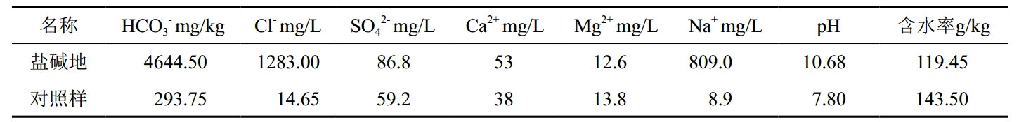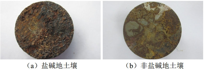 選用材質(zhì)為X65管線(xiàn)鋼,裸露面積為6.5 cm2的圓形試片, 其主要化學(xué)成分(質(zhì)量分數%)為: C 0.03,Si 0.17,Mn 1.51,P 0.024,Ni 0.17,Cu 0.04,Mo 0.16等。取某鹽堿地現場(chǎng)土壤樣品,以北京市昌平區非鹽堿地土壤為對照試樣,于實(shí)驗室進(jìn)行理化性能測試(表 1)。表明鹽堿地土樣的HCO3-、 Cl-、SO42-、pH明顯高于對照土樣;兩種土壤成分可以代表典型鹽堿地和非鹽堿地土壤條件。