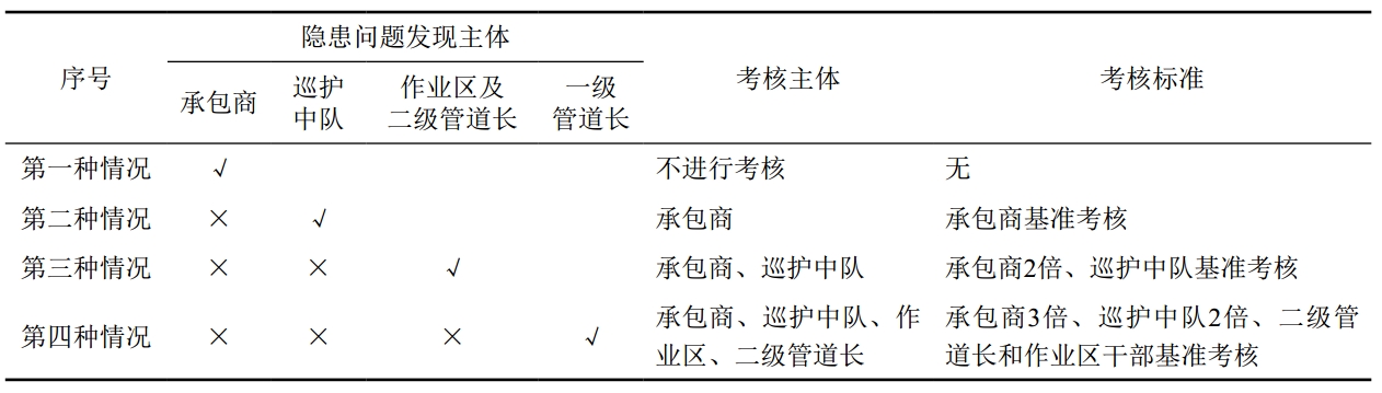 健全體系,發(fā)揮追責“連環(huán)扣”作用。建立一級管道長(cháng)、二級管道長(cháng)、管道運維隊和業(yè)務(wù)承包商逐級監督機制,以及遞增式考核的追責體系(表 1),通過(guò)逐級“加碼”、壓力傳導,激勵各層級主動(dòng)發(fā)現和處理問(wèn)題,有效提升各自安全責任意識和擔當意識。