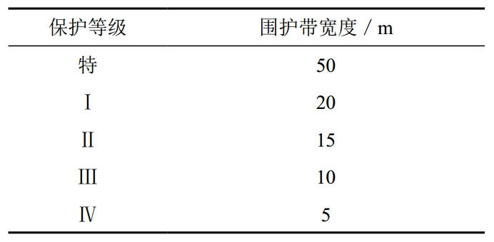 構筑物受護范圍應當包括受護對象及其圍護帶。圍護帶寬度必須根據受護對象的保護等級確定,可按規定的數值選用(表 2)。